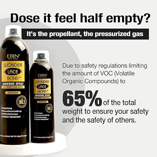 - [ADHESIVE SPRAY] Elevate your wig game with the EBIN NEW YORK Wonder Lace Bond Adhesive Spray, the ultimate melting spray designed to secure your wig flawlessly. This advanced formula seamlessly blends into your hairline, providing a natural look that enhances your wig's appearance. Perfect for lace front wigs, toupees, and hairpieces, this adhesive spray ensures a secure and flawless finish every time